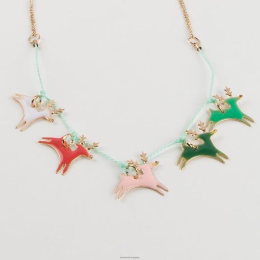 Los renos son elegantes íconos navideños que a todos los niños les encantan y lucen súper especiales en este collar. Están confeccionados con esmalte colorido con detalles en tono dorado brillante y ensartados en un cordón encerado de color menta y una cadena en tono dorado.