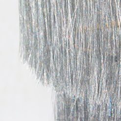 Esta hermosa lámpara de araña agregará brillo y brillo a cualquier celebración. Bellamente elaborado con oropel plateado, con detalles de terciopelo y cordón.
